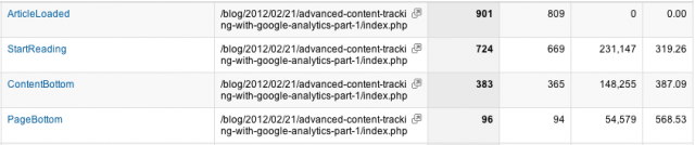 The last column has the required data. Content Bottom is the event that should be paid attention to. This is the time taken by readers to reach the end of the piece from the time they start reading it. If this number (in seconds) aligns pretty well with the Time to Finish you estimated, then the content has steam.