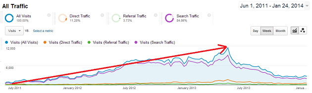 And then it all happened. Espire ran out of fuel in mid-air, Penguin hit, traffic nosedived, an unnatural link spam action hit, traffic crashed.