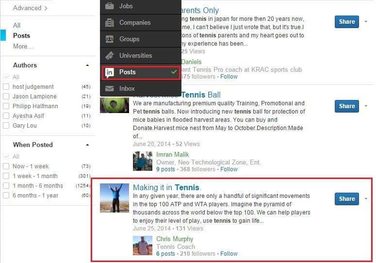 LinkedIn made it easy for everyone to search for influencer posts on any topic with a way to discover content directly from search box. There’s a specific tab for ‘posts’ that displays the top posts published by influencers.