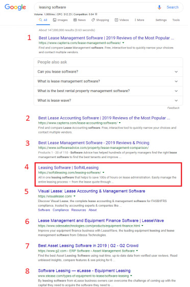 The screenshot below shows that the target page is ranking on the 4th position in the search engine results page for the main keyword, “leasing software.”