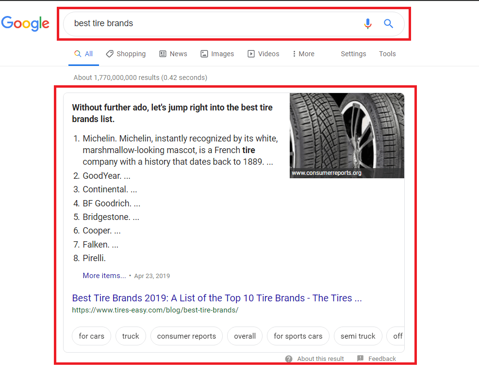 Google Featured Snippet for the keyword ‘Best Tire Brands’ which has a search volume of 8.3K.