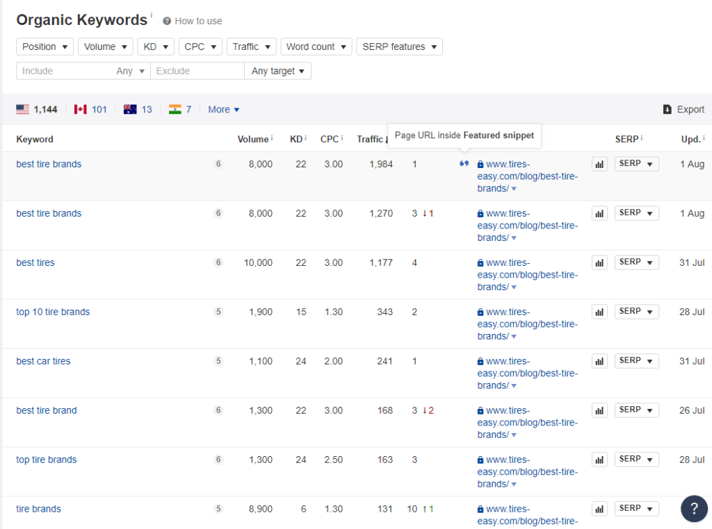 After filtering out various keywords, we finalized two: ‘Best tire Brands’ and ‘top tire brands’ on which a long-form content can be created. This content would mention all the major tire brands.